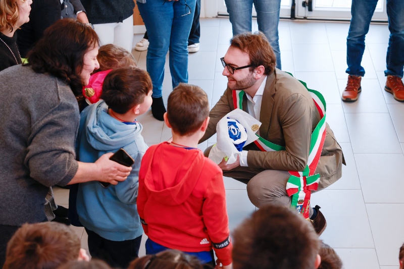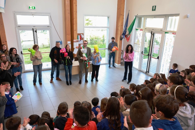 A ricevere la delegazione, la dirigente Maria Anna Bergantino, le maestre e ovviamente alunne e alunni della scuola primaria di via Saettino.
