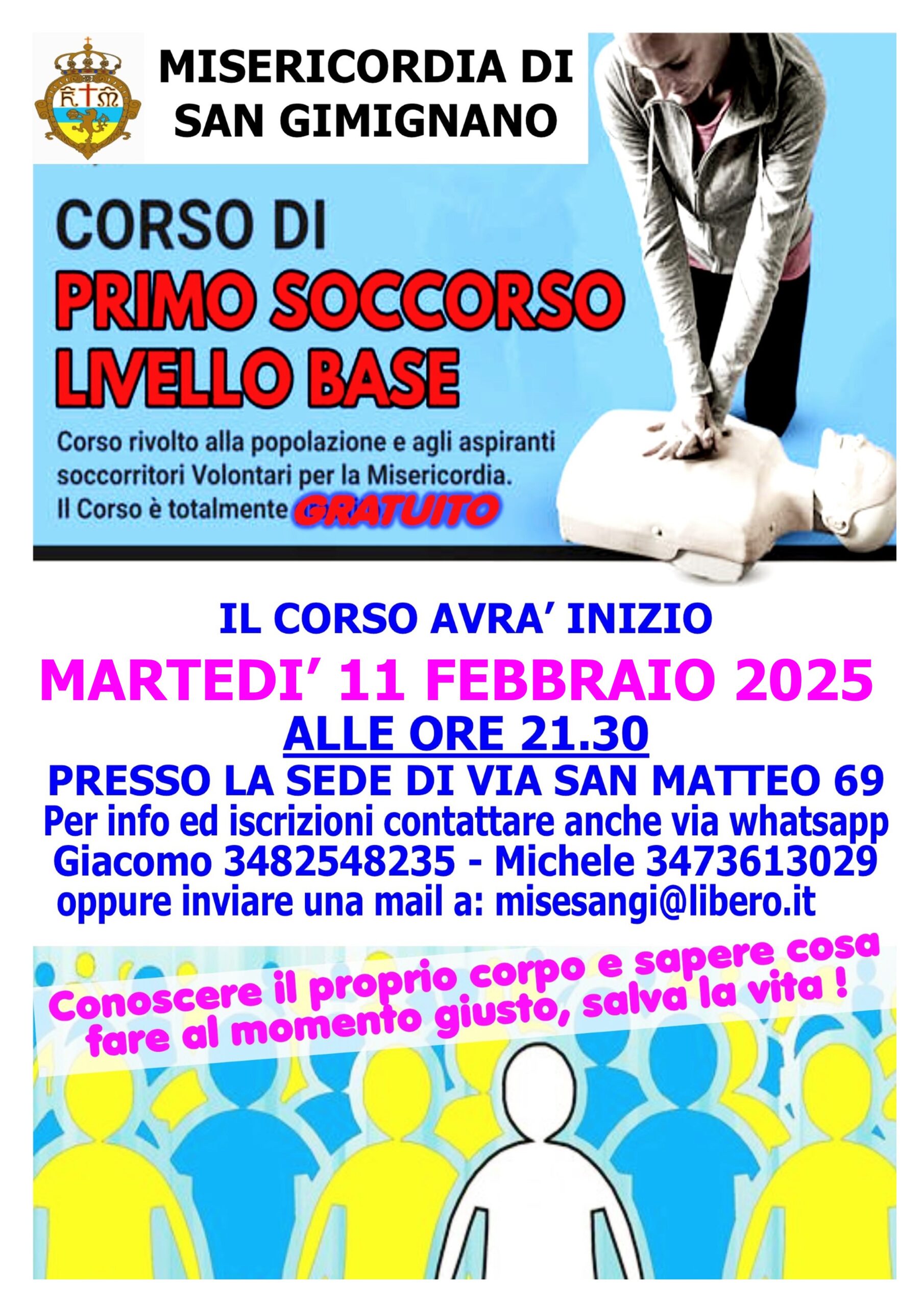 Ancora pochi giorni per iscriversi al corso per soccorritore di 1° livello, o “di base”, promosso gratuitamente dalla Misericordia di San Gimignano ed aperto a tutti i cittadini dai 16 anni in poi. Il corso inizierà martedì 11 febbraio prossimo e si articolerà in una decina di lezioni, teoriche e pratiche, che si svolgeranno presso la sede della Misericordia di via San Matteo. E’ possibile presentarsi anche direttamente l’11 febbraio presso la sede per aderire al Corso.