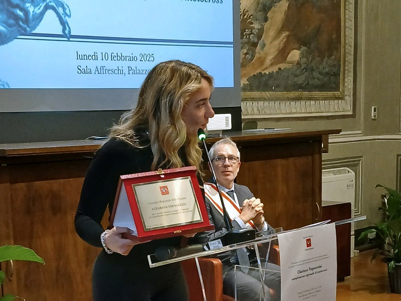 Il Consiglio regionale della Toscana ha voluto premiare la campionessa regionale di motocross Clarissa Tognaccini per i successi ottenuti, il coraggio e l’impegno nel rappresentare lo sport femminile nel motociclismo. La cerimonia di consegna della targa da parte del vicepresidente dell’Assemblea legislativa Stefano Scaramelli si è tenuta nella sala Affreschi di palazzo del Pegaso lunedì 10 febbraio.