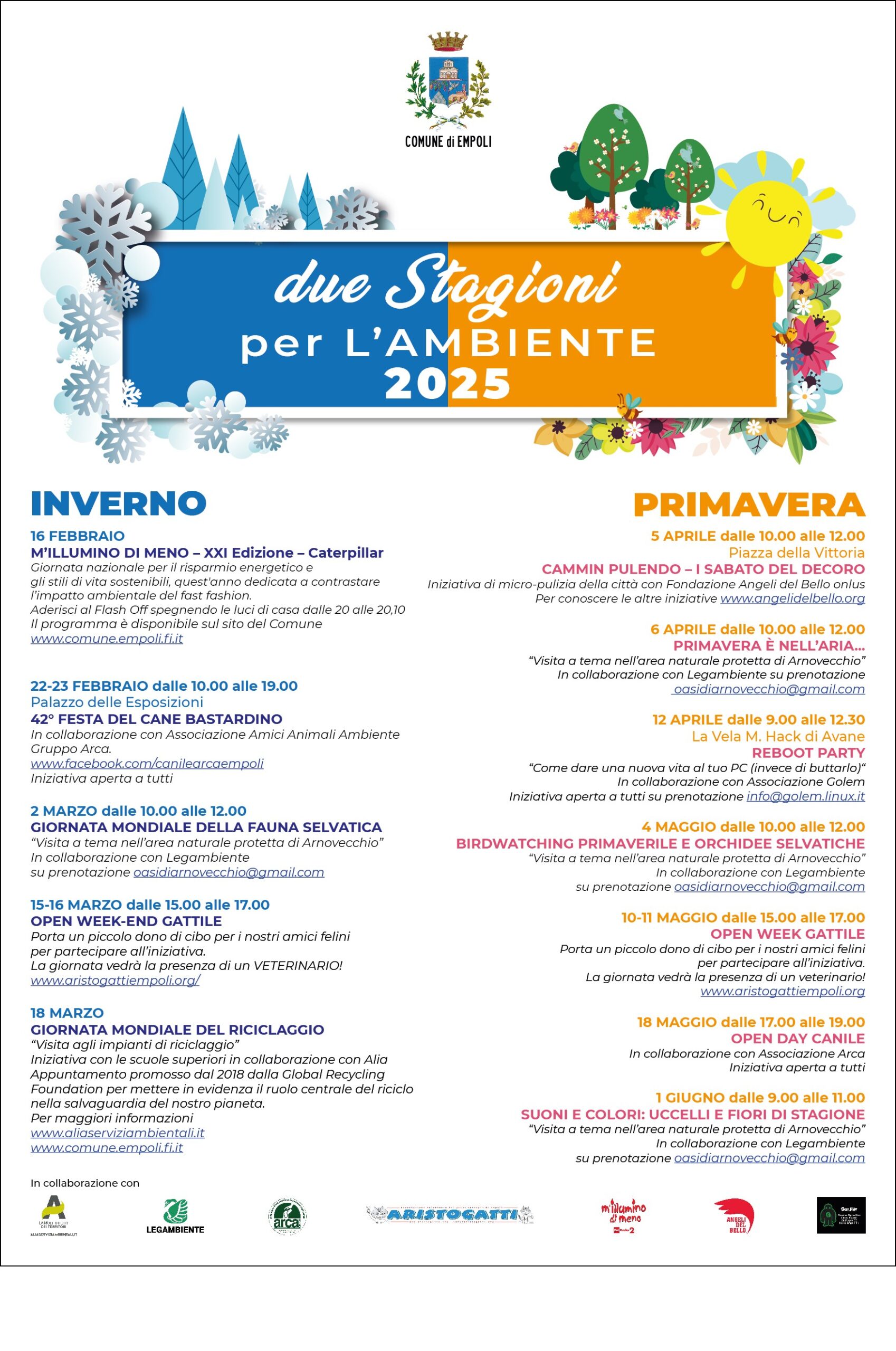 L’amministrazione comunale, l’ufficio ambiente, insieme a tante associazioni del territorio anche quest’anno promuovono un cartellone di iniziative e attività aperte alla comunità, per tutte le età: torna “Due stagioni per l’ambiente”. Dopo il successo della rassegna ‘Un Autunno per l’ambiente’ ecco le nuove ‘stagioni’ che porteranno eventi sul territorio, da febbraio a giugno 2025, il cui intento è coinvolgere grandi e piccoli non solo per ‘fare’ ma per migliorare la qualità della vita nella nostra città.