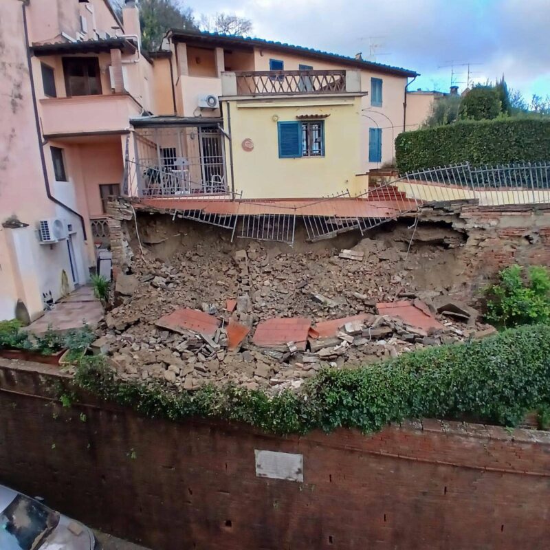 Le forti piogge di questo pomeriggio (14 febbraio) hanno provocato la caduta di un terrazzo su un giardino sottostante, proprietà di un appartamento privato ubicato in via Rondoni, nel centro storico di San Miniato, i cui massi di ricaduta hanno invaso la carreggiata di via de’ Mangiadori danneggiando almeno tre auto in sosta. Sono quattro le famiglie che i vigili del fuoco non hanno fatto rientrare in casa, valutando significativo il danno riportato alla struttura che comprende appunto quattro appartamenti.