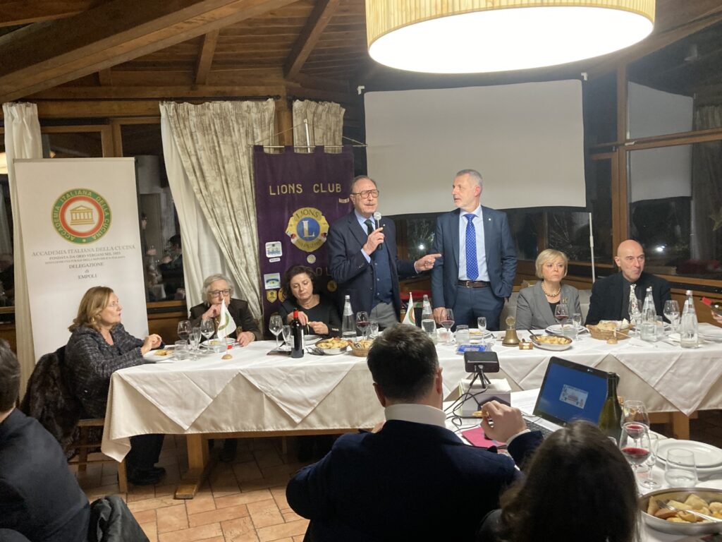 Dopo i saluti iniziali del Delegato della Accademia di Empoli, Prof. Massimo Vincenzini e del presidente del Lions club Empoli, Francesco Salvadori, si è aperto il ricco menu con paccheri all’anatra ed uno scenografico girarrosto ; molto apprezzato anche il cinghiale in umido con erbetta di campo , piatti tipici del locale .
