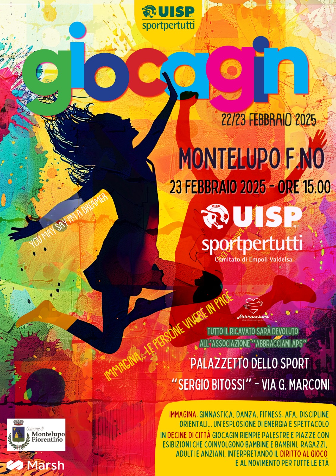Giocagin, la manifestazione organizzata dalla Uisp con l'obiettivo di unire i valori dello sport e della solidarietà, sbarcherà domenica 23 febbraio al Palasport “Sergio Bitossi” di Montelupo. Dal pomeriggio si alterneranno esibizioni di ginnastica, danza, fitness, Afa, discipline orientali: una vera e propria esplosione di energia e spettacolo.
