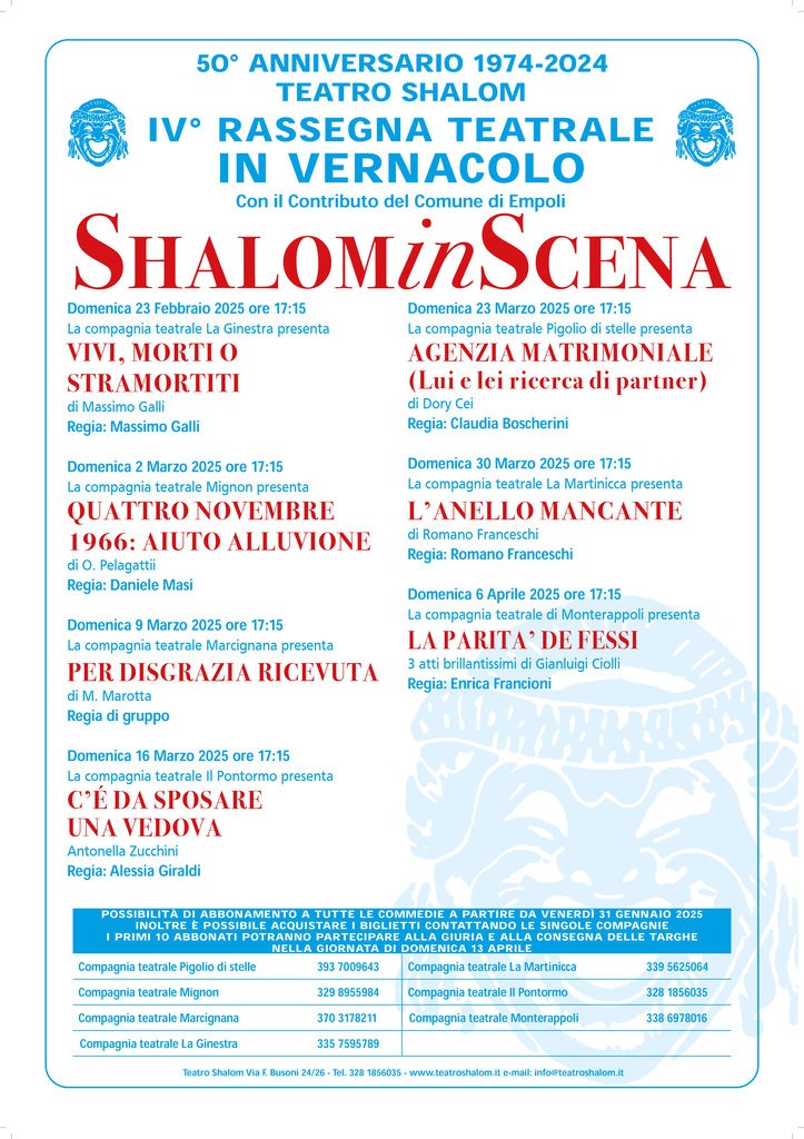 orna Shalom in Scena! Da domenica 23 febbraio alle 17.15 torna al Teatro Shalom la rassegna di Teatro Amatoriale Shalom in Scena. Sette appuntamenti che porteranno in scena spettacoli in vernacolo toscano con le compagnie teatrali amatoriali di zona, da febbraio fino ad aprile.