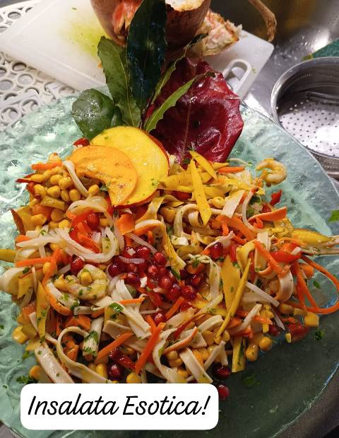 Mi ha dato una ricetta un po' particolare un Insalata Esotica con tante verdure e frutta. Tra gli ingredienti particolari il Mango e il Surimi.