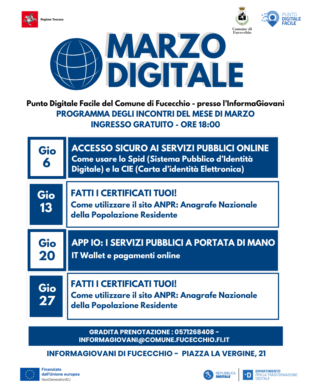 Si ricorda che è gradita la prenotazione al numero 0571 268408 o via mail all’indirizzo informagiovani@comune.fucecchio.fi.it.