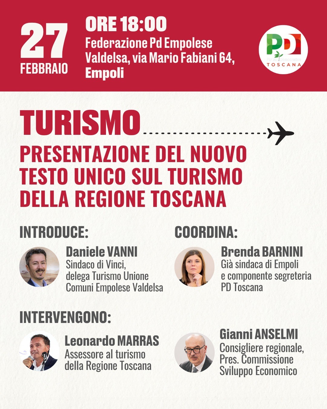 Una serie di incontri per raccontare obiettivi ed opportunità del nuovo Testo Unico sul Turismo della Regione Toscana. Prosegue su tutto il territorio regionale l’iniziativa del Pd Toscana per far conoscere ancora di più i contenuti della norma votata dal Consiglio regionale in materia di turismo e valorizzarla attraverso eventi aperti alla cittadinanza che vedono la partecipazione dell’assessore al Turismo Leonardo Marras ed il presidente della commissione Sviluppo economico e rurale Gianni Anselmi, insieme ad amministratori locali e regionali.