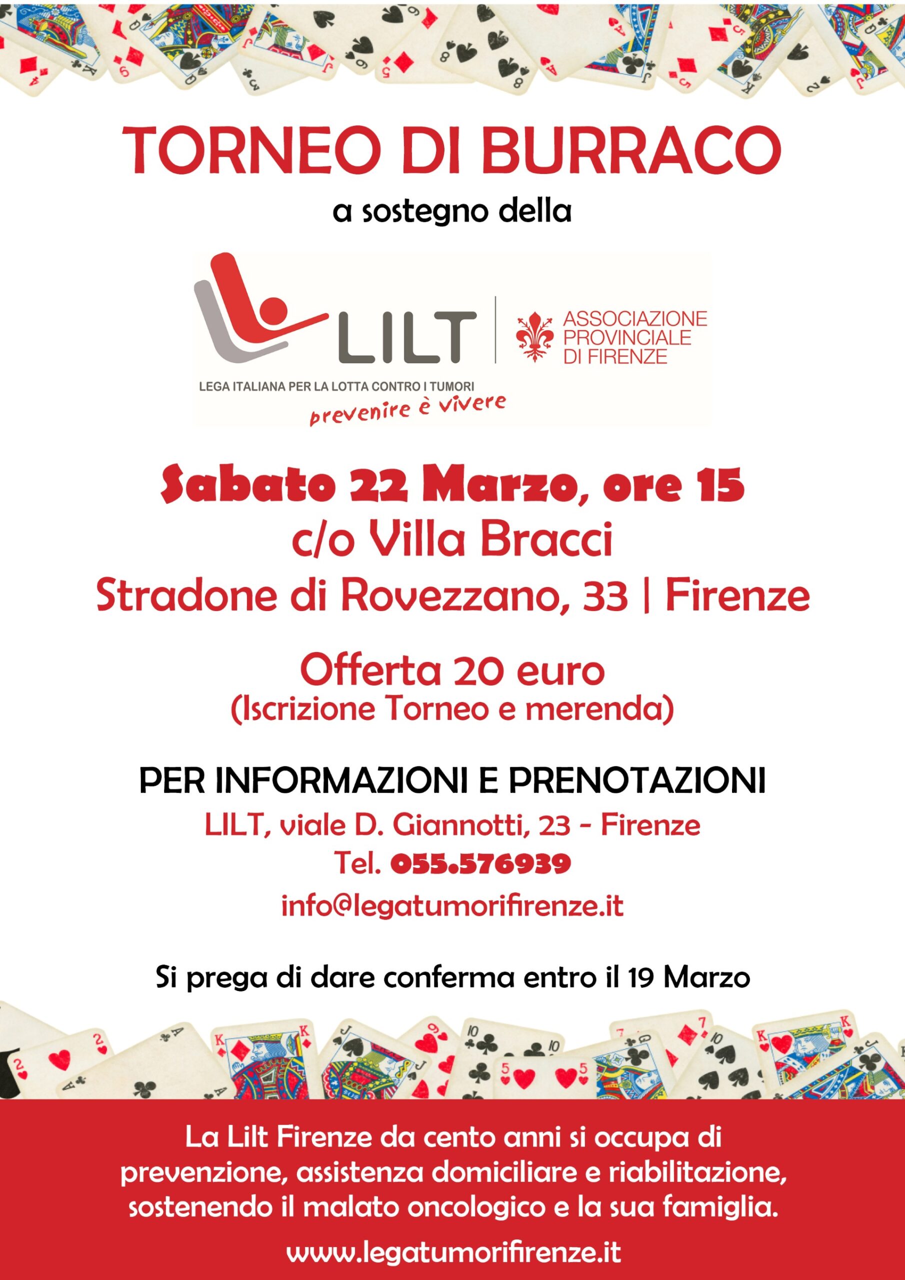 Un pomeriggio di divertimento e solidarietà. Sabato 22 marzo, alle 15 a Villa Bracci (Stradone di Rovezzano, 33) a Firenze si svolgerà un torneo di burraco il cui ricavato andrà a sostenere le attività della Lega Italiana per la Lotta contro i Tumori Firenze. In particolare i fondi raccolti andranno a supportare attività di prevenzione, diagnosi precoce, assistenza domiciliare e riabilitazione oncologica portate avanti da Lilt Firenze.