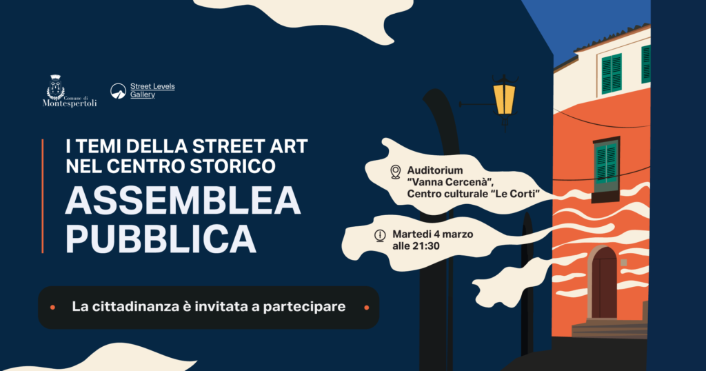 Il Comune di Montespertoli, in collaborazione con Street Levels Gallery, invita la cittadinanza a partecipare all’assemblea pubblica dedicata ai temi della Street Art nel centro storico, in programma martedì 4 marzo alle ore 21:30 presso l’Auditorium "Vanna Cercenà" del Centro Culturale "Le Corti".