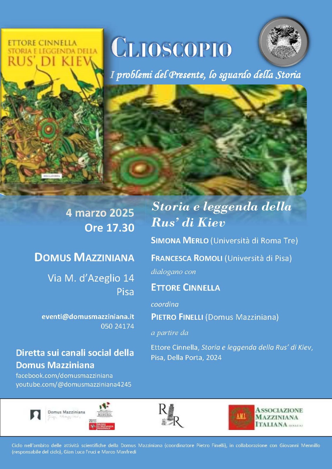 Il ciclo di incontri, che si propone di affrontare con un approccio storico e una visione prospettica di lungo periodo i grandi temi dell’attualità, dedica l’evento di martedì all’Ucraina, alle sue origini storiche a partire dal volume di Ettore Cinnella, già docente di storia dell’Europa orientale all’Università di Pisa, e tra i maggiori studiosi del mondo slavo, Storia e leggenda della Rus’ di Kiev, meritoriamente pubblicato nel 2024 dalle edizioni Della Porta, piccola ma attivissima casa editrice pisana.