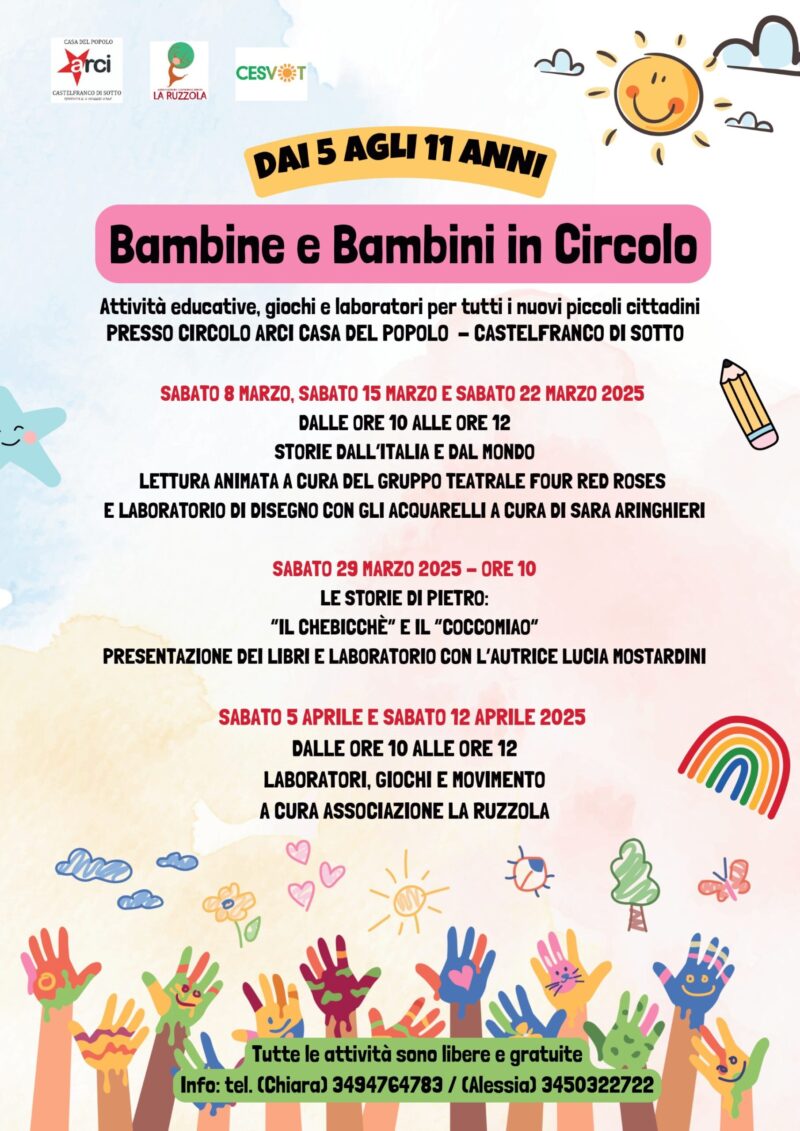 Parte sabato 8 marzo “Bambine e Bambini in Circolo”, un insieme di attività educative e laboratoriali nei sabati di marzo e aprile rivolte ai bambini/e tra i 5 e i 11 anni, a partecipazione libera e gratuita. Il progetto, pensato per favorire le competenze sociali dei partecipanti, si svolgerà il sabato mattina presso gli spazi del Circolo Casa del Popolo ApS di Castelfranco presso la sede in via Prov.le Francesca Sud 32 in collaborazione con l'Associazione La Ruzzola e con il sostegno di CESVOT Toscana