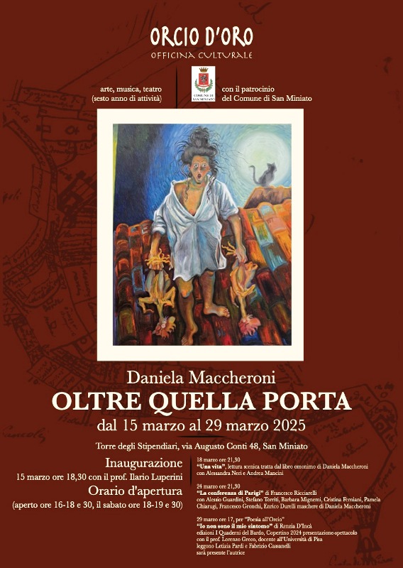 Dal 15 al 29 marzo 2025, avrà il patrocinio del Comune di San Miniato, e si annuncia come una delle mostre più significative tra quelle organizzate all’Orcio d’oro: “Daniela Maccheroni: Oltre quella porta”. L’inaugurazione vedrà la presenza del prof. Ilario Luperini, curatore anche del catalogo che uscirà proprio il giorno dell’inaugurazione, il 15 marzo prossimo alle 18,30. La mostra resterà aperta tutti i giorni della settimana (esclusa la domenica), dalle 16 alle 18 e 30, il sabato ore 18 alle 19 e 30. A completare l’importante esposizione ci saranno tre serate, che, come al solito, mischiano teatro e letteratura, vita e arte, in un percorso sempre di estremo interesse. Nell’esposizione ospitata a San Miniato, saranno moltissimi gli autoritratti: quella di Daniela Maccheroni è una specie di ossessione, una ricerca attraverso se stessa, con la propria immagine imparata a memoria, o vista, intravista, in superfici specchianti, che la moltiplicano, con risultati di forte interesse artistico. Anche nelle figure che Daniela Maccheroni compone, in situazioni spesso di sofferenza e di tortura, lei continua a rappresentare se stessa, siano essi uomini o donne, crocifissioni o parti, chi soffre è sempre lei, la protagonista assoluta delle opere: sono da segnalare, ne aumentano il valore di documento della condizione esistenziale della persona che le ha realizzate.