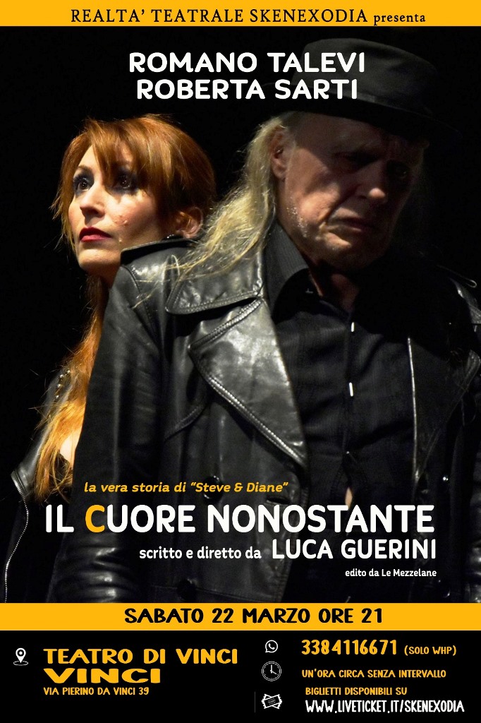 Il secondo appuntamento della rassegna professionistica organizzata dalla Realtà Teatrale Skenexodia a Vinci, sotto la direzione artistica di Luca Guerini, si terrà il prossimo 22 marzo. Dopo il debutto con il giallo al contrario Le cose che ti fanno sentire vivo, in scena a partire dalle ore 21 andrà lo spettacolo Il cuore nonostante, con protagonisti Romano Talevi (volto noto per le sue partecipazioni nel cast del quiz Avanti un altro, le serie Dostoevskij, Suburra Eterna e il film Bassifondi, oltre ad una lunga carriera in teatro) e Roberta Sarti (Fedra, Fuori/Dentro, Il gioco, Storie di boxe…).