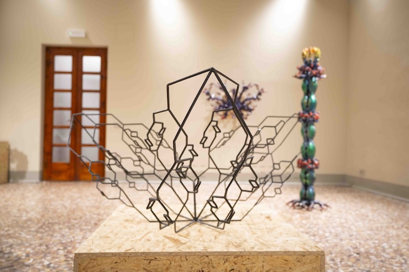 In dialogo con queste forme organiche, una grande struttura geometrica in ferro al centro dello spazio espositivo enfatizza per contrasto la tensione tra biomorfismo e astrazione, tra naturale e artificiale.