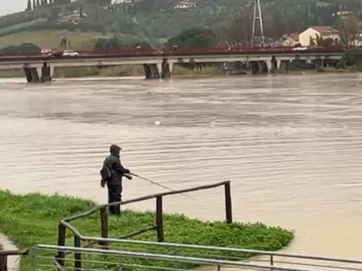 Mentre l'Arno minacciava di straripare e la pioggia scrosciava senza sosta, un uomo, anonimo ma determinato, ha ben deciso di sfidare il maltempo scendendo sull'argine armato di canna da pesca e impermeabile, per pescare. Un comportamento impudente che è andato contro tutte le raccomandazioni che fin dalla mattina le autorità stavano diffondendo attraverso canali ufficiali, social e giornali: "Non uscite se non necessario e state lontano dai fiumi"