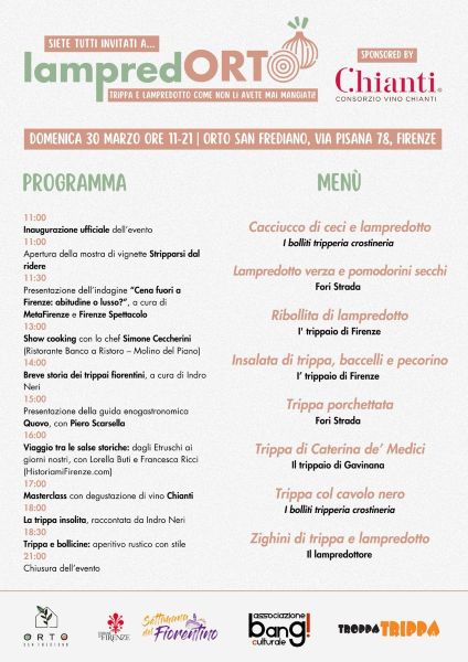 Organizzato da Associazione Bang! e TroppaTrippa.com, con il supporto del Consorzio Vino Chianti e il patrocinio dell’Accademia della Trippa, LampredOrto fa parte del calendario ufficiale della Settimana del Fiorentino, promossa dal Comune di Firenze.