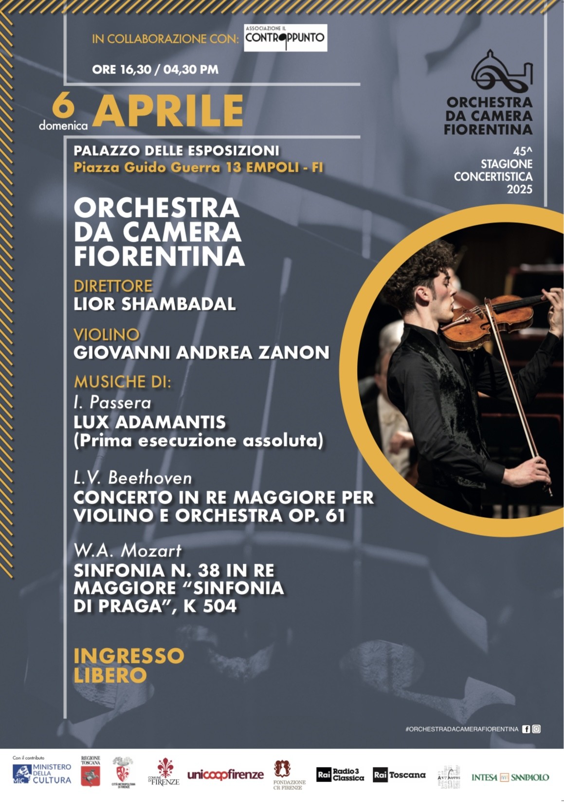 Appuntamento con la grande musica al Palazzo delle Esposizioni di Empoli (piazza G.Guerra 13). Domenica 6 aprile 2025 alle 16.30, sarà possibile ascoltare l’Orchestra da Camera Fiorentina e il talentuoso violinista Giovanni Andrea Zanon: ammesso al conservatorio C. Pollini di Padova nel 2002, all’età di quattro anni, è il più giovane ammesso nella storia delle istituzioni musicali statali italiane e, nonostante la sua giovane età, si è già esibito in alcune delle sale più prestigiose del mondo, tra le quali la Carnegie Hall di New York, il Teatro alla Scala di Milano, la Elbphilharmonie di Amburgo, il Teatro La Fenice di Venezia, la Philharmonie di Parigi, il Musikverein di Graz, la Smetana Hall di Praga, la Bayerische Staatsoper di Monaco, il Festspielhaus di Baden-Baden, il Gran Teatre del Liceu di Barcellona, la Royal Opera House di Muscat, il Konserthuset di Stoccolma e l’Arena di Verona.