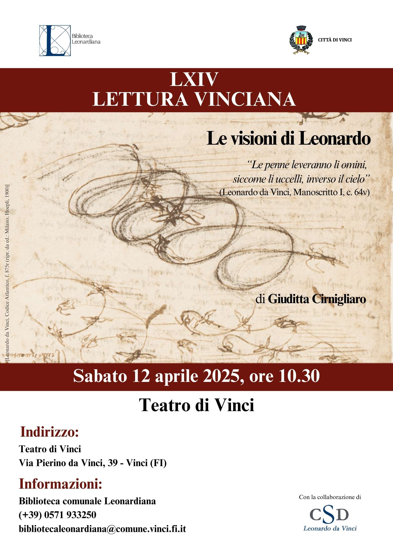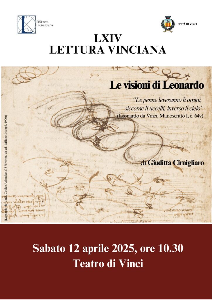 6Nell'anno in cui il Comune di Vinci dedica le proprie manifestazioni al volo, la Lettura Vinciana del 2025, giunta alla sua 64ª edizione, affronterà il tema del volo come visione nella produzione letteraria leonardiana.