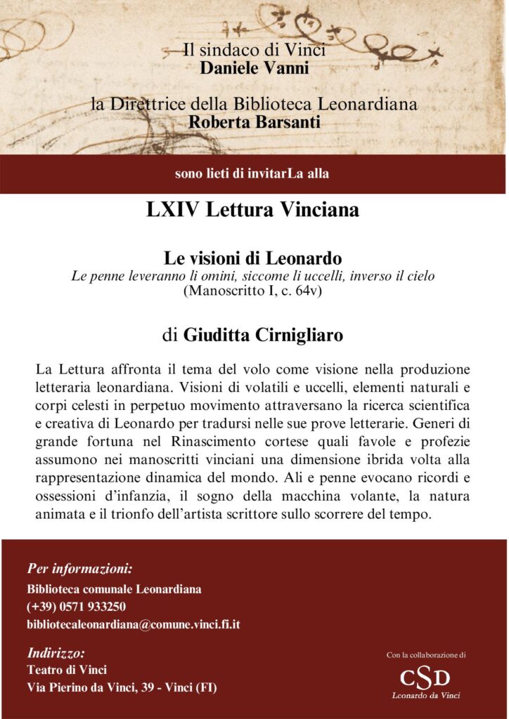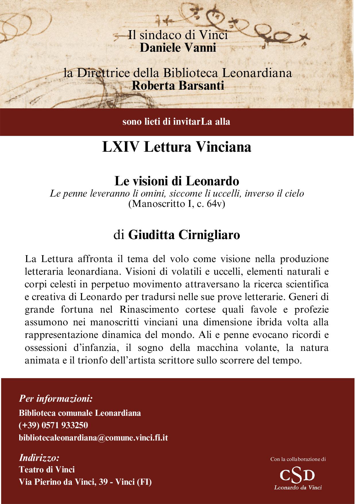 La 64ª Lettura Vinciana è organizzata dal Comune di Vinci a cura della Biblioteca Leonardiana, in collaborazione con il Centro internazionale di Studi e Documentazione Leonardo da Vinci.