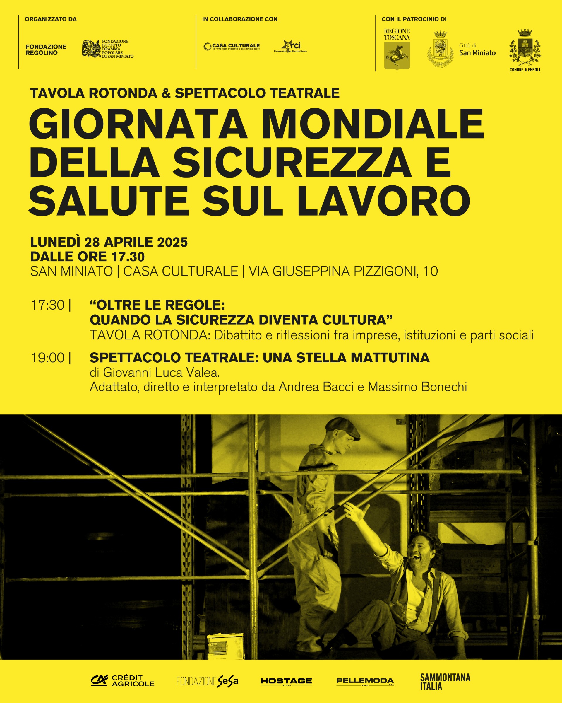 In occasione della Giornata Mondiale della Sicurezza e Salute sul Lavoro, la Fondazione Regolino e il Dramma Popolare di San Miniato presentano con orgoglio lo spettacolo teatrale “Una stella mattutina”, in programma lunedì 28 aprile 2025 alle ore 19 presso la Casa Culturale di San Miniato di Via Pizzigoni 10. L’iniziativa è organizzata dalla Fondazione Regolino e dal Dramma Popolare di San Miniato, in collaborazione con ARCI e Casa Culturale di San Miniato, e patrocinata dalla Regione Toscana, dal Comune di San Miniato e dal Comune di Empoli.