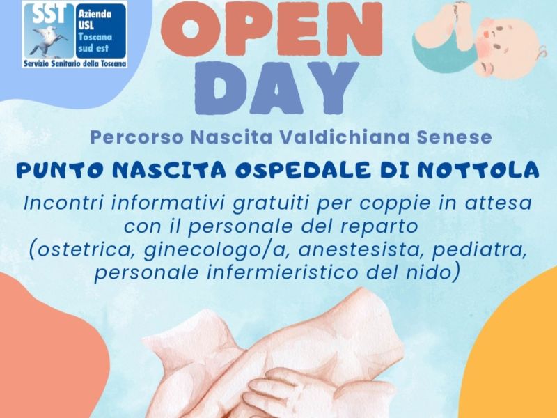 A partire dalle 17 di mercoledì 30 aprile, il Punto nascita dell’ospedale di Nottola aprirà le porte ai futuri genitori interessati a conoscere i servizi offerti. L’appuntamento con l’open day sarà replicato anche il 28 maggio, il 25 giugno, il 30 luglio, il 27 agosto, il 24 settembre, il 26 novembre e il 17 dicembre.