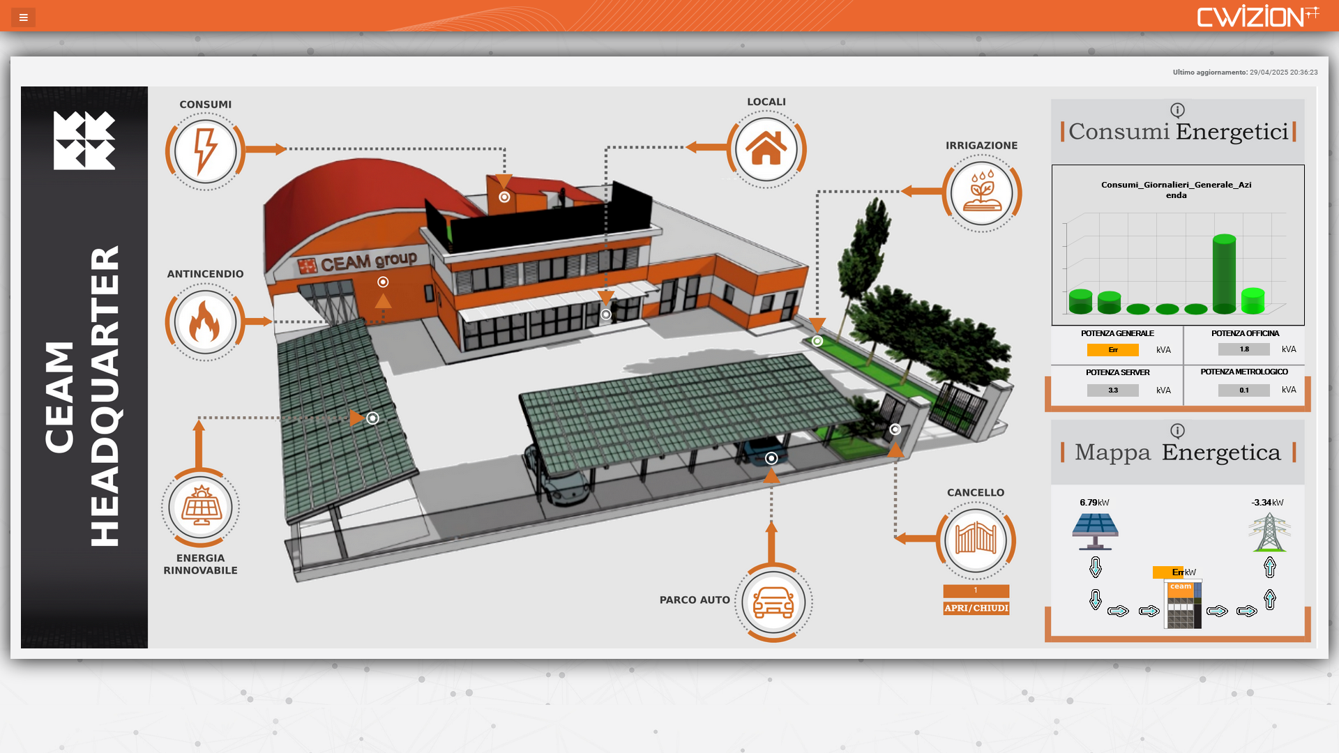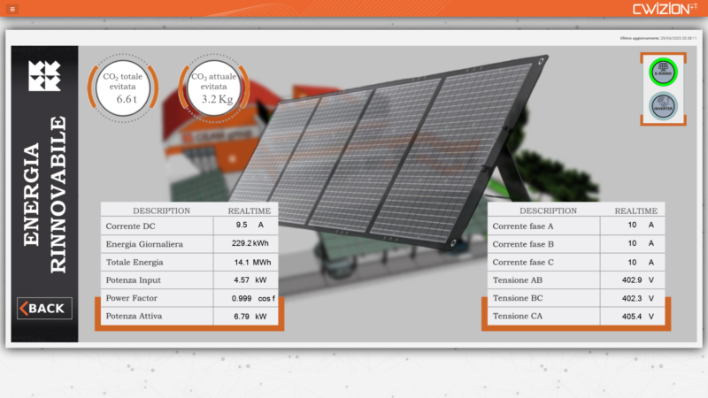 Oltre alla progettazione e realizzazione dell’impianto fotovoltaico, è stato interconnesso in ottica 5.0 alla supervisione centralizzata, che è basata su uno dei nostri prodotti di punta interamente progettato da CEAM e sviluppato in oltre 20 anni, la Piattaforma Software CWS IoT di Monitoraggio e Controllo. Tale software oltre a gestire in maniera integrata tutti i consumi energetici aziendali e controllare la produzione da parte dell’impianto fotovoltaico è già predisposto per la gestione integrata e condivisa di comunità energetiche e tutte le funzioni per il dispacciamento, argomento molto attuale al giorno d’oggi.