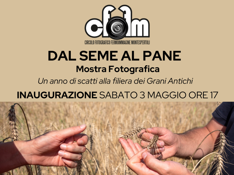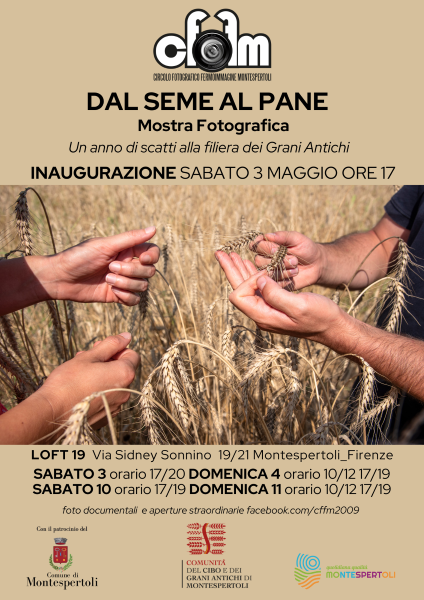 Dal 3 all’11 maggio 2025, presso LOFT 19 in via Sonnino 19/21 a Montespertoli, si terrà la mostra fotografica 'Dal seme al pane', a cura del Circolo Fotografico Fermoimmagine (CFFM). Il progetto è il risultato di un anno di lavoro sul campo, in collaborazione con la Comunità del Cibo e dei Grani Antichi di Montespertoli.