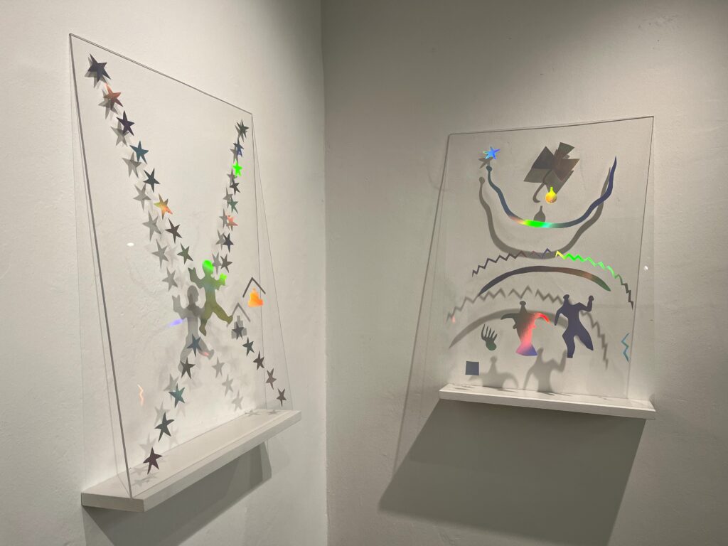 Sottilissimo e raffinato il passaggio tra una fase e l’altra che avviene grazie a una reiterata interazione, così le opere nere contengono una parte bianca e quelle bianche una parte di colore, a sottolineare il procedere continuativo e consequenziale. Lo stile pittorico è quello tipico della produzione artistica di Guerrilla Spam, con uno spiccato simbolismo, molteplici figure stilizzate e segni incisivi che si stagliano su ampie campiture.
