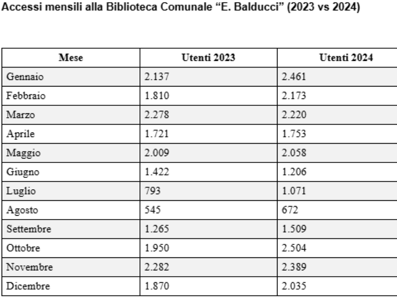 Nel corso del 2024, la biblioteca ha registrato 22.051 accessi totali, con un aumento di quasi 2.000 utenti rispetto al 2023, quando erano stati 20.082. La crescita si è distribuita su quasi tutti i mesi dell’anno, con picchi nei mesi di ottobre (2.504 utenti), novembre (2.389) e gennaio (2.461).