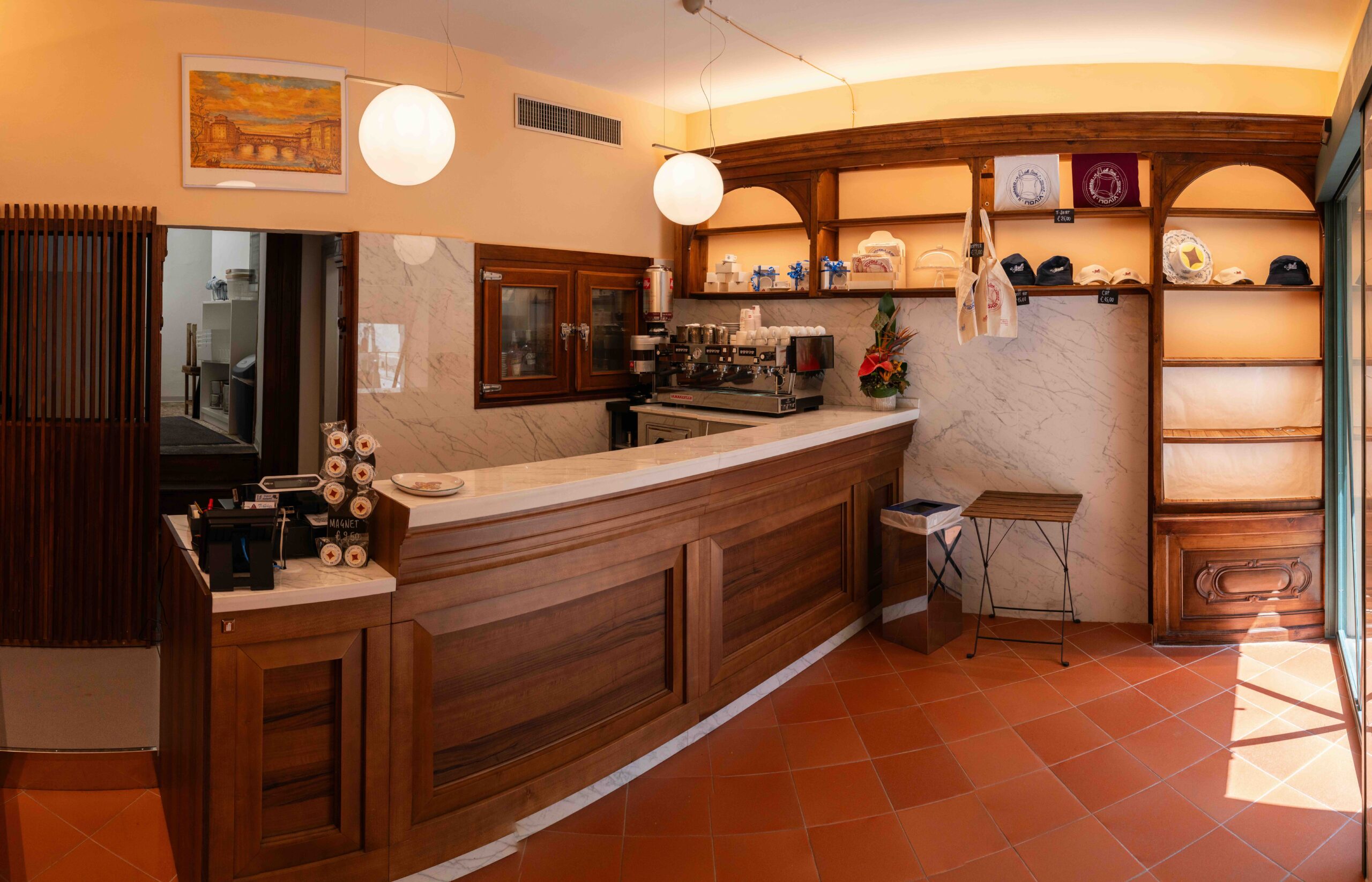 GELATERIA VIVOLI ED AFFOGATO BAR – Il locale della Gelateria Vivoli si trova ancora nella sede storica di Via Isola delle Stinche, a pochi passi da Piazza Santa Croce. L’arredamento attuale, dopo varie ristrutturazioni dovute anche all’alluvione del 1966, è in stile liberty di cui ancora vanta i legni originali, affiancati dal pavimento in cotto, inserti in marmo e l’affresco di Luigi Fallai, allievo di Annigoni. Il nuovo locale, arredato in modo da abbinarsi alla storica gelateria, ospita anch’esso mobili e bancone in legno, inseriti in marmo e pavimenti in cotto.