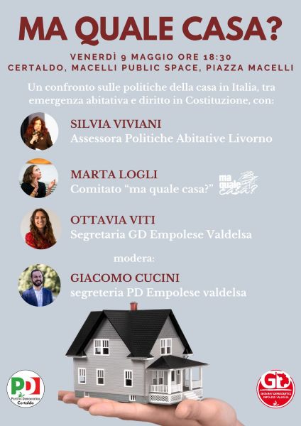 Il Partito Democratico di Certaldo ha organizzato l’incontro “Ma quale casa? Politiche della casa in Italia, tra emergenza abitativa e diritto costituzionale”, che si terrà venerdì 9 maggio alle 18.30 presso Macelli public space (Piazza Macelli, Certaldo).