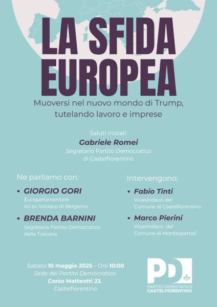 Il Partito Democratico di Castelfiorentino ha organizzato per sabato 10 maggio alle 10.00 un incontro sul tema “La nuova sfida europea. Muoversi nel mondo di Trump, tutelando lavoro e imprese”.