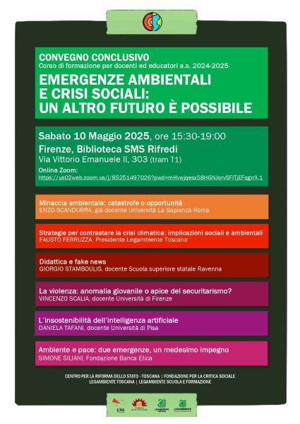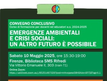 Sabato 10 maggio 2025, dalle 15:30 alle 19:00, si terrà presso la Biblioteca SMS di Rifredi (via Vittorio Emanuele II, 303 – Firenze, facilmente raggiungibile con la tramvia T1) il convegno conclusivo del corso di formazione per docenti ed educatori dell’anno scolastico 2024/2025 dal titolo Emergenze Ambientali e Crisi Sociali: Un altro Futuro è Possibile.