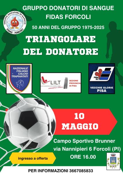 L’amore e la dedizione al proprio territorio ha tante sfaccettature e si mostra in modi diversi. Il prossimo fine settimana vedrà i festeggiamenti con eventi sportivi e culturali per i 50 anni del Gruppo Donatori di sangue di Forcoli, che si terranno presso il centro sportivo Nuova Primavera di Forcoli. Ad arricchire le celebrazioni un triangolare di calcio che vede impegnate la Nazionale italiana trapiantati, LILT -lega italiana lotta contro i tumori e Vecchie glorie del Pisa.