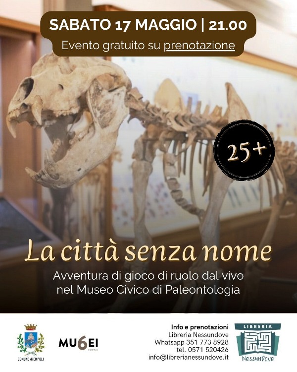 Dopo le iniziative per bambini e ragazzi, quest'anno i musei si avventurano nelle iniziative dei giochi di ruolo per adulti dal vivo. Una novità assoluta al Museo Civico di Paleontologia in occasione della Notte Europea dei Musei. Sabato 17 maggio alle 21 si terrà Una notte al Museo – La Città Perduta: un piccolo gruppo di persone potrà accedere al Museo in notturna e partecipare a una misteriosa avventura con enigmi da risolvere per poter guadagnare nuovamente l’uscita! L'evento è realizzato in collaborazione con la libreria Nessundove.