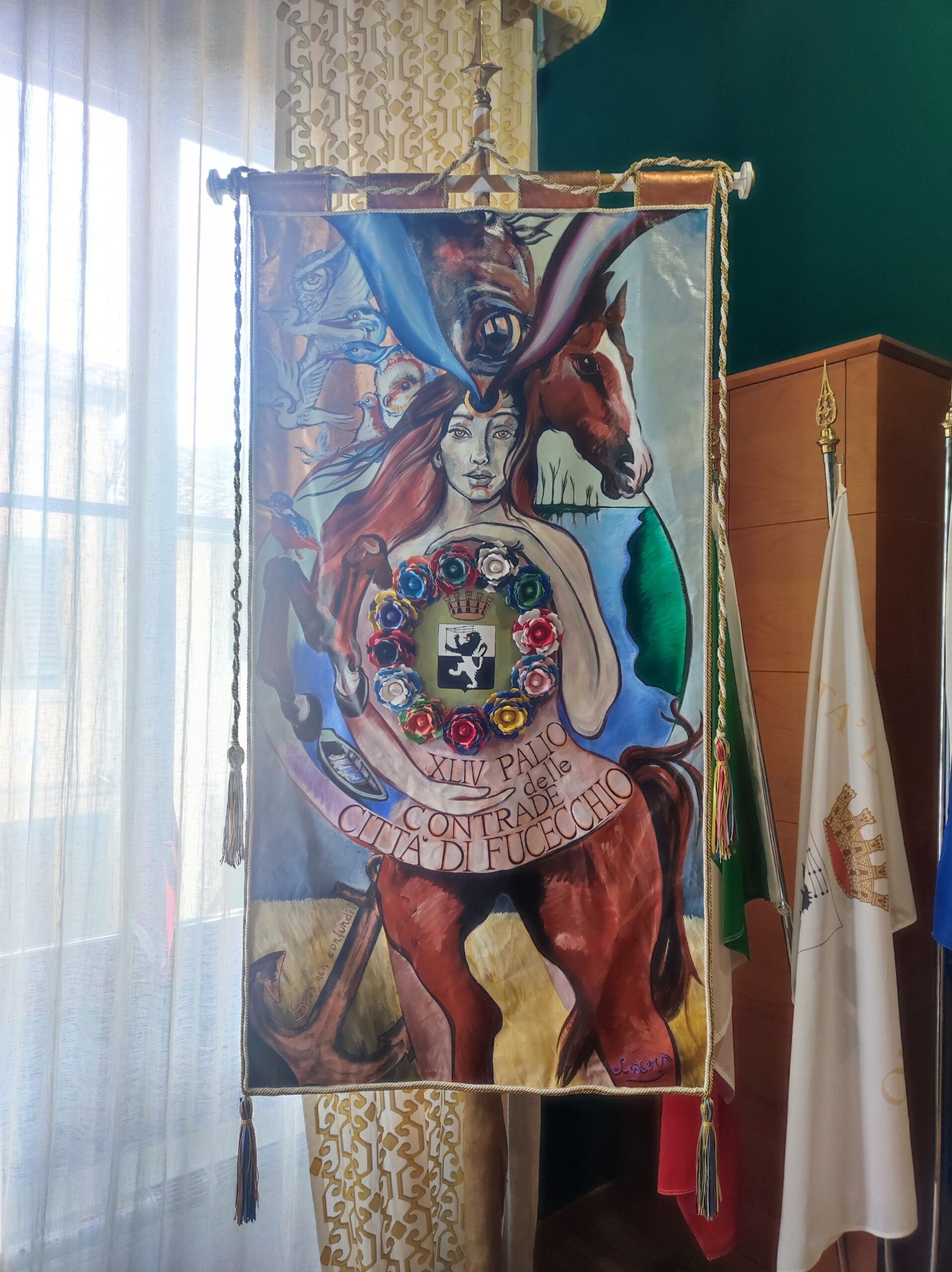 Il nuovo cencio raffigura una donna - un'amazzone - con "nel cuore e nella pancia il mandala con le contrade", ogni contrada è una rosa coi colori specifici e fatte con la pelle, prodotto principe del territorio. C'è anche un'ancora, "simbolo della speranza" e ovviamente un cavallo a farla da padrone. È un'opera d'arte al femminile, creata dalle mani di Annalisa Betella e Stefania Gori. Ambedue docenti, hanno trasformato la passione per l’arte nel loro percorso professionale, cercando oggi di trasmettere questa passione agli studenti dell’Istituto Comprensivo Fucecchio. Dalla scuola alla piazza alla buca, il percorso a Fucecchio è quello e lo testimoniano le centinaia di ragazzi e ragazze che sfilano, sbandierano e urlano in una serata che, a costo di sembrare retorici, pare magica.
