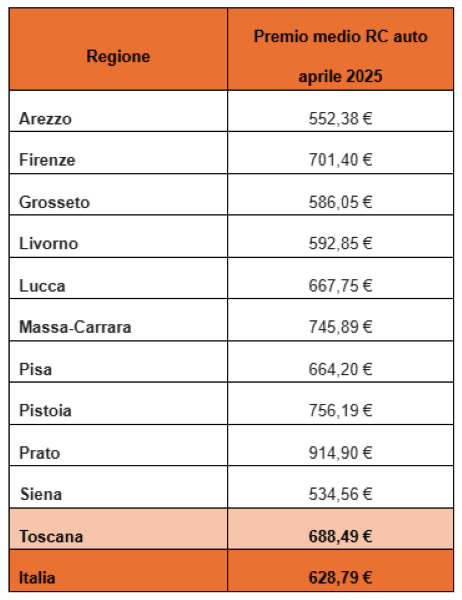 Secondo l’Osservatorio RC auto Facile.it - Assicurazione.it*, ad aprile 2025 i premi medi per assicurare un’auto in Toscana sono diminuiti dello 0,7% su base semestrale, scendendo a 688,49 euro. Nonostante il calo, la regione è risultata essere la terza area italiana con il premio medio più alto, preceduta solo da Campania e Lazio.