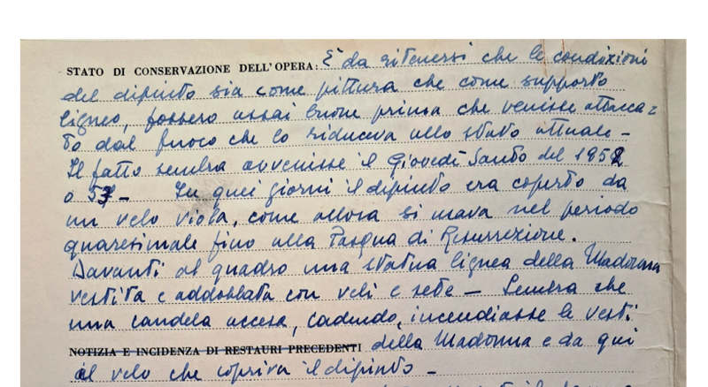 La Del Vivo precisa anche, e documenta con fotografie particolareggiate, che fu scelto di non intervenire con la ricostruzione pittorica delle parti distrutte dalle fiamme, ma di lasciare in pratica tutto com’era, andando però a recuperare con puliture accurate le zone rimaste illese o quasi.