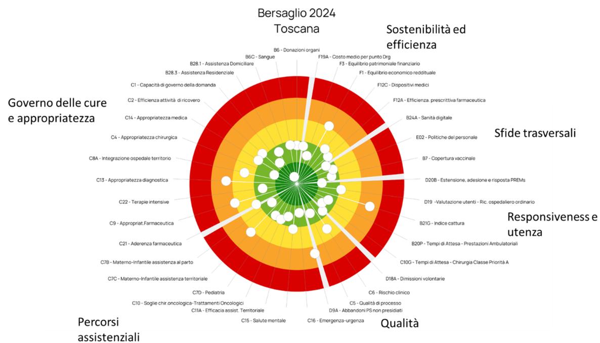 Dei 158 indicatori di valutazione presenti sul bersaglio, in Aoup il 68% ha una performance ottima o buona, mentre solo il 7,6% ce l’ha pessima. Ciò comporta una concentrazione degli indicatori verso il centro del bersaglio, a mostrare un miglioramento rispetto al 2023.