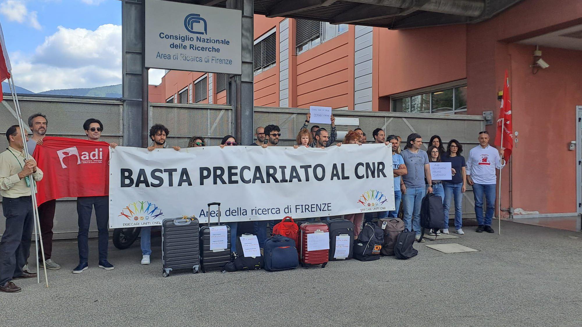 Si è tenuto stamani davanti alla sede del CNR di Sesto Fiorentino, dentro il Polo universitario, un flash mob del movimento dei precari uniti (che hanno sfilato conducendo trolley, prima di fotografarsi con uno striscione con la scritta "Basta precariato al Cnr", composto da ricercatrici e ricercatori (centinaia in tutta Italia) che stanno svolgendo le loro attività con contratto a tempo determinato. Grazie ai fondi del PNRR infatti in questi anni si sono aperte numerose attività di ricerca, che però al momento, senza un vero investimento da parte dello Stato, sono destinate all’estinzione.