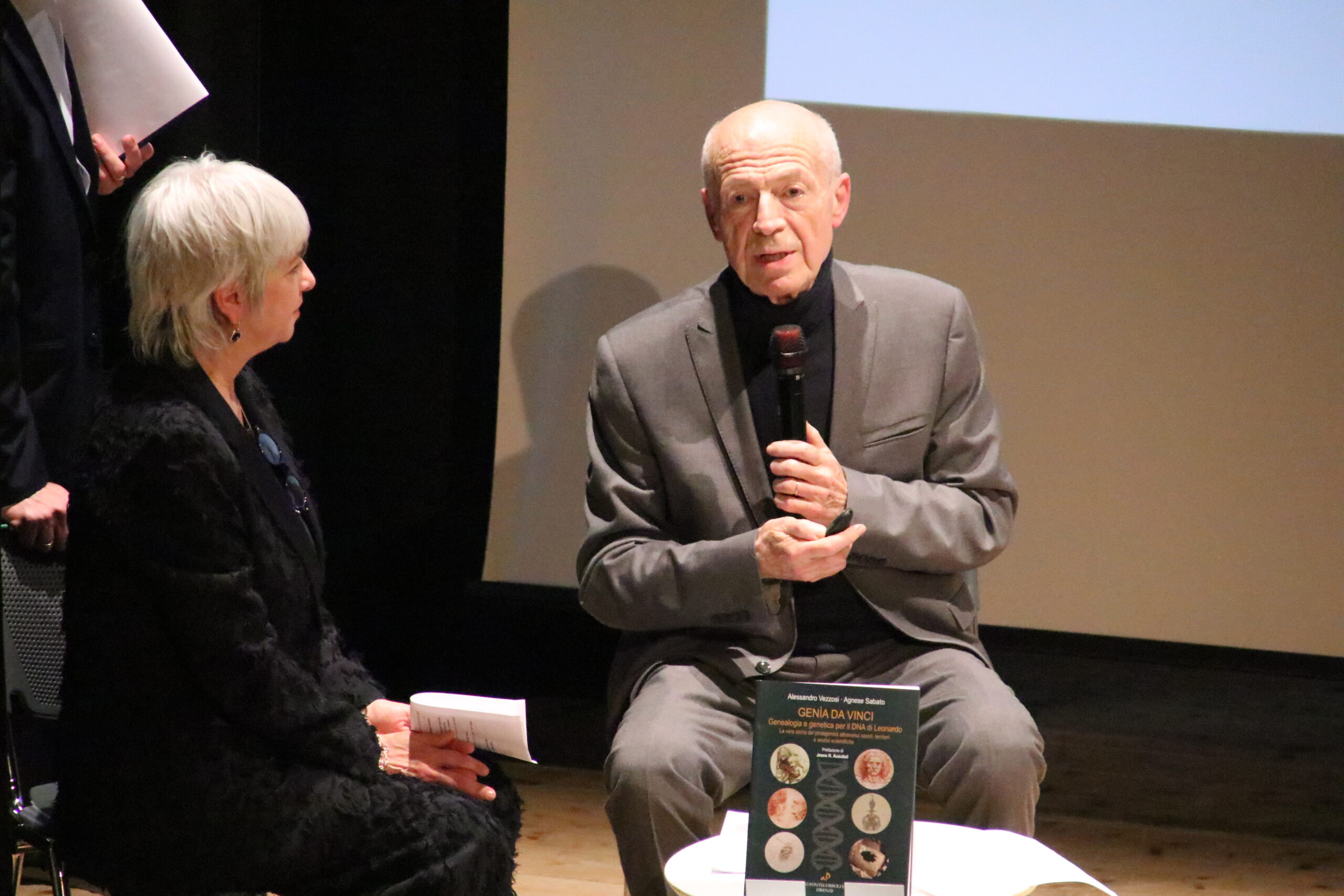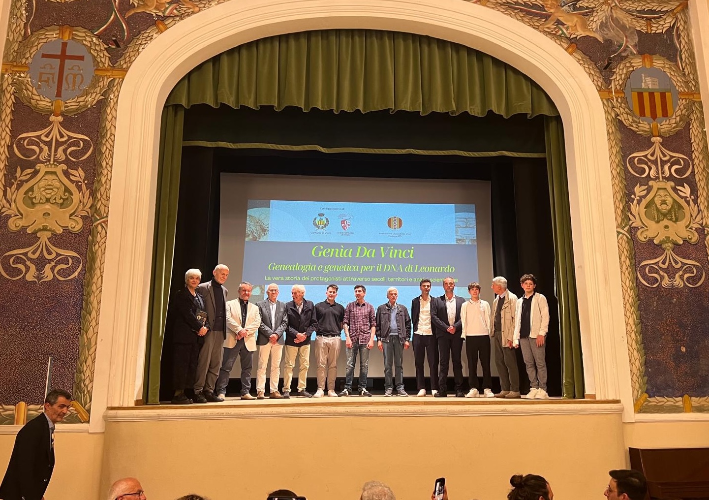 Teatro di Vinci gremito ieri sera, giovedì 22 maggio, per la presentazione del volume "Genìa Da Vinci. Genealogia e genetica per il Dna di Leonardo" di Alessandro Vezzosi e Agnese Sabato (Angelo Pontecorboli Editore), anticipata dalla rivelazione dei contenuti il 21 maggio (qui i dettagli). Tra gli argomenti principali trattati dal libro, c’è un complesso albero genealogico documentato dagli autori che risale al 1331, l’identificazione di 15 discendenti in linea maschile del padre e del fratellastro di Leonardo e il riscontro, tramite esame del Dna condotto in collaborazione con l’Università di Firenze, di porzioni del Cromosoma Y coincidenti tra sei di questi, confermando la continuità genetica della linea maschile della famiglia Da Vinci almeno a partire dalla XV generazione. Discendenti presenti alla serata che, al teatro di Vinci, sono saliti sul palco.