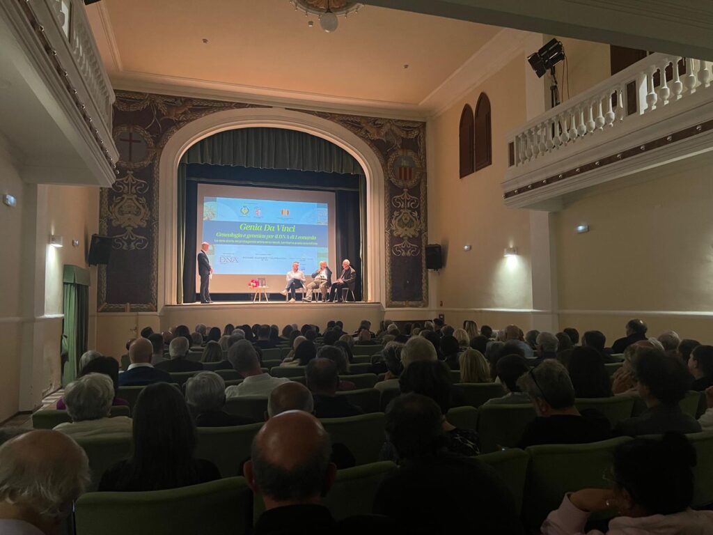 Teatro di Vinci gremito ieri sera, giovedì 22 maggio, per la presentazione del volume "Genìa Da Vinci. Genealogia e genetica per il Dna di Leonardo" di Alessandro Vezzosi e Agnese Sabato (Angelo Pontecorboli Editore), anticipata dalla rivelazione dei contenuti il 21 maggio (qui i dettagli). Tra gli argomenti principali trattati dal libro, c’è un complesso albero genealogico documentato dagli autori che risale al 1331, l’identificazione di 15 discendenti in linea maschile del padre e del fratellastro di Leonardo e il riscontro, tramite esame del Dna condotto in collaborazione con l’Università di Firenze, di porzioni del Cromosoma Y coincidenti tra sei di questi, confermando la continuità genetica della linea maschile della famiglia Da Vinci almeno a partire dalla XV generazione. Discendenti presenti alla serata che, al teatro di Vinci, sono saliti sul palco.