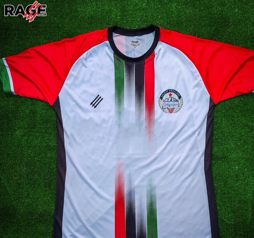 Oltre al tricolore palestinese, la divisa riporta anche il simbolo dell’Eiserne Front – le tre frecce antiautoritarie nate nella Germania della Repubblica di Weimar – oggi adottato da alcuni movimenti antifascisti nel mondo. La maglia è stata realizzata da Rage Sport, brand italiano di abbigliamento sportivo legato al mondo del calcio 'popolare' e 'antifascista'.