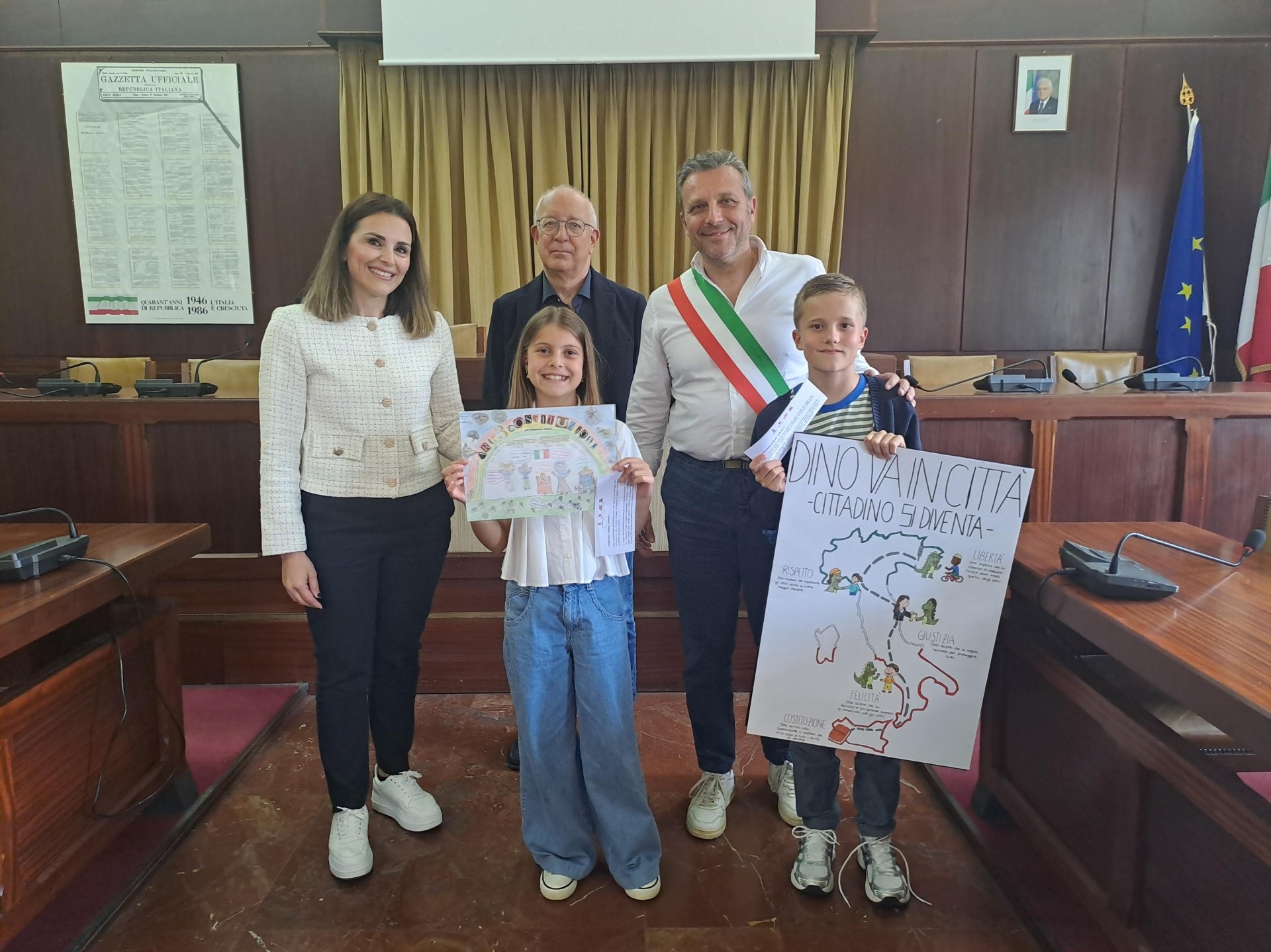 Si è concluso ieri con la premiazione dei vincitori in consiglio comunale dalle mani del sindaco Roberto Giannoni la prima edizione del progetto di “Dino va in città – Cittadino si diventa”. Questa iniziativa, promossa dall’assessore all'educazione alla cittadinanza Renato Rusconi, nasce con l’obiettivo di favorire nelle nuove generazioni l’identificazione con una comunità fondata sui principi condivisi della Costituzione Italiana, ponendo come tema conoscitivo i diritti e dei doveri dei cittadini.