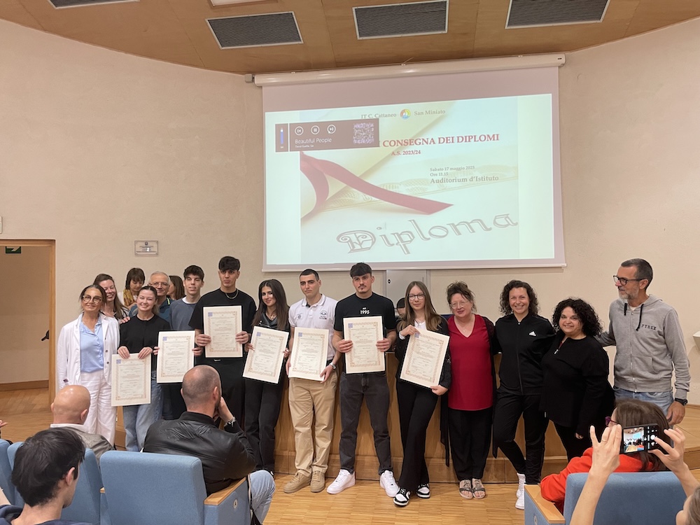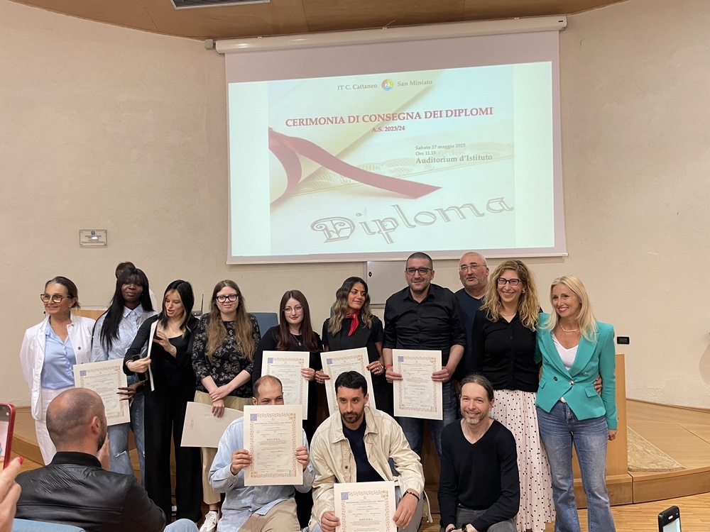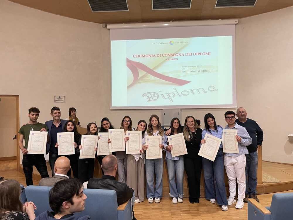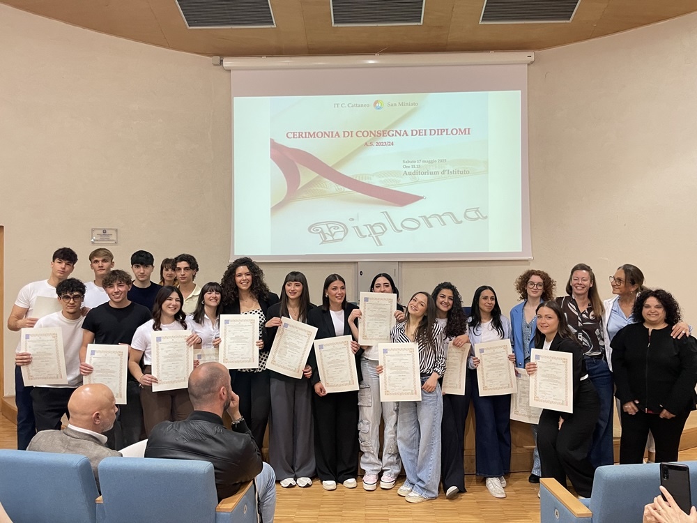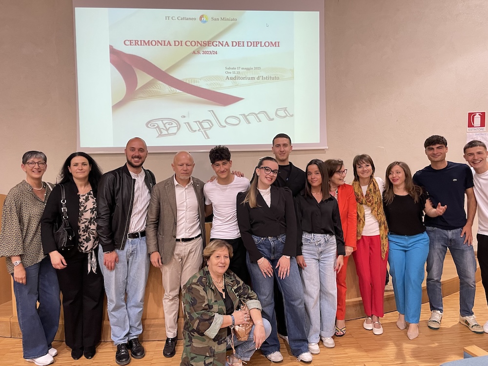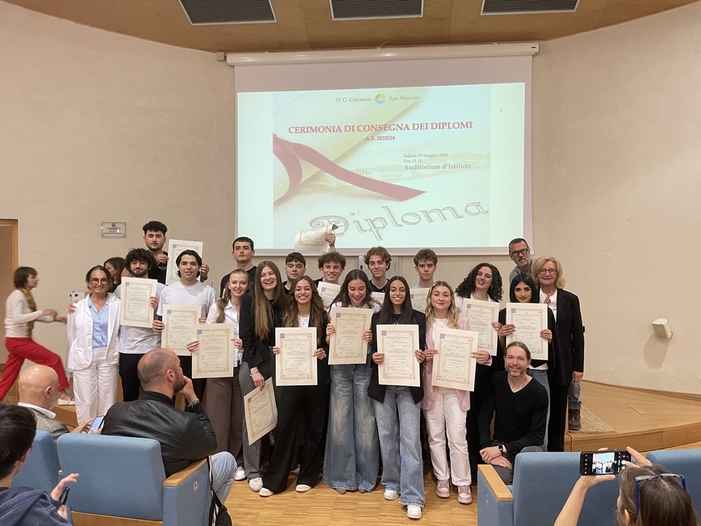 Sabato 17 maggio, presso l’Auditorium dell’Istituto Tecnico “C. Cattaneo” di San Miniato, si è svolta, come da tradizione ormai consolidata, la Cerimonia di Consegna dei Diplomi, dedicata agli studenti e alle studentesse che hanno concluso con successo il loro percorso scolastico nell’anno 2023-2024. L’evento ha visto la partecipazione della Dirigente Scolastica, Prof.ssa Elena Casarosa, del Sindaco di San Miniato, Simone Giglioli, dell’Assessore all’Istruzione, Matteo Squicciarini, e dei rappresentanti del Consiglio di Istituto. Alla presenza delle istituzioni e delle famiglie, i diplomati hanno ricevuto il tanto atteso attestato direttamente dalle mani dei loro ex insegnanti, rendendo ancora più significativo e simbolico il momento. La cerimonia non ha rappresentato soltanto la conclusione di un ciclo di studi, ma è stata soprattutto un’occasione per celebrare un importante traguardo personale e collettivo: il raggiungimento del diploma, frutto di anni di impegno, sacrifici, sfide affrontate e superate. Un riconoscimento che sancisce la fine di un percorso ma, al tempo stesso, apre le porte a nuove opportunità nel mondo universitario, lavorativo e nella crescita individuale. Nel corso della mattinata, carica di emozione e partecipazione, sono stati proiettati alcuni video ricordo, ripercorrendo i momenti più belli e significativi vissuti durante gli anni trascorsi tra i banchi del “Cattaneo”. I video, ricchi di aneddoti, volti e sorrisi, hanno offerto l’occasione per ringraziare gli insegnanti, salutare compagni e amici, e raccontare i primi passi compiuti nella nuova fase della loro vita, fatta di esperienze personali, formative e professionali. A rendere ancora più speciale l’appuntamento, è stato l’impegno degli studenti e delle studentesse del social team dell’istituto, che con grande dedizione e spirito di iniziativa hanno documentato l’intero evento, immortalando con fotografie e contenuti digitali i momenti più toccanti e simbolici della cerimonia. Un ringraziamento anche ai rappresentanti di istituto che hanno pensato ai video, alle musiche e a consegnare i diplomi. Una mattinata che si è così trasformata in una vera e propria festa della scuola, un’occasione per riconoscere il valore del cammino compiuto, per ritrovare un senso di appartenenza e per rinnovare l’orgoglio di far parte di una comunità scolastica viva, accogliente e proiettata con fiducia verso il futuro dei propri ragazzi e ragazze. Un momento che resterà nel cuore di chi lo ha vissuto, come simbolo non solo della fine di un percorso, ma soprattutto dell’inizio di nuove possibilità.