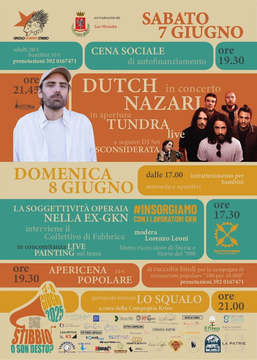 Ad aprire la serata musicale sarà la Tundra, gruppo alternative rock di Pisa noto per l’intensità dei suoi live e un sound in continua evoluzione. A seguire lo stile unico di Dutch Nazari, rapper e cantautore nato a Padova, che si racconterà mescolando musica, poesia e critica sociale.