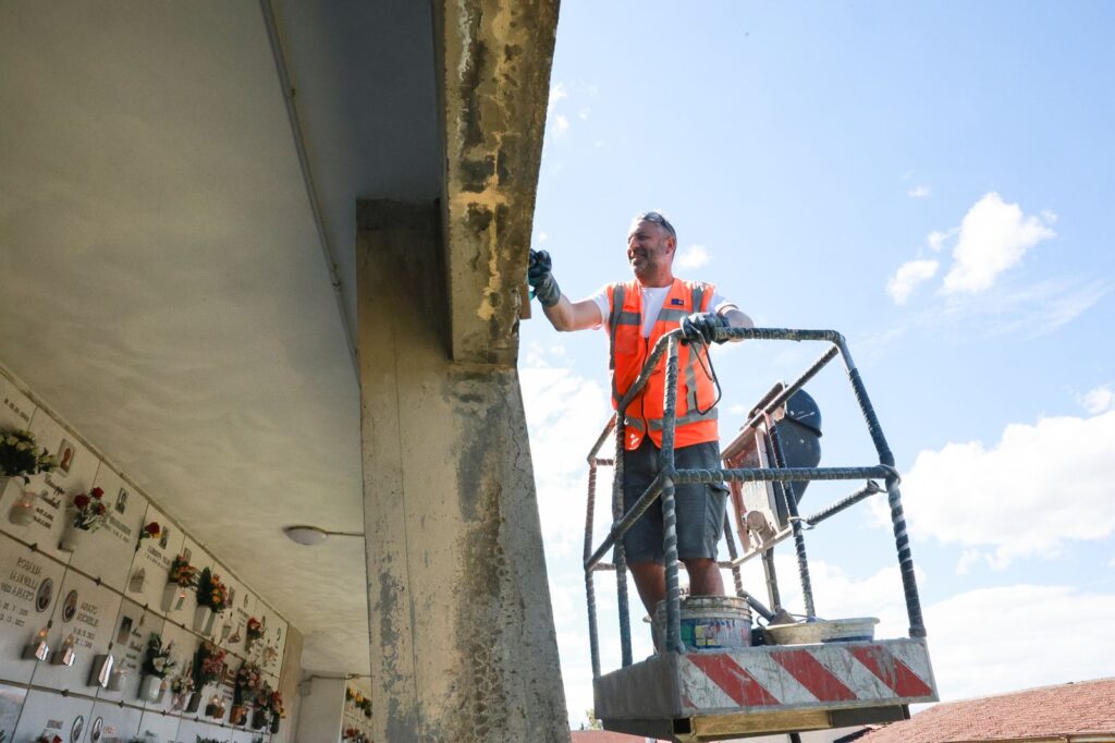 CIMITERI - Prosegue la manutenzione a un ampio blocco di loculi del cimitero comunale Sant'Andrea, prossimo all'ingresso secondario. Dal recupero superficiale del calcestruzzo armato degradato sulle strutture, alla pulizia meccanica della pavimentazione; dalla sostituzione degli elementi danneggiati della cimasa in laterizio, fino all'imbiancatura finale.
