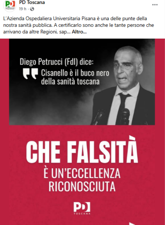 Dal messaggio originale, sul profilo Facebook di PD Toscana, si legge: "L'Azienda Ospedaliera Universitaria Pisana è una delle punte della nostra sanità pubblica. A certificarlo sono anche le tante persone che arrivano da altre Regioni, sapendo di trovare qui cure di qualità, professionalità e umanità. Per questo è inaccettabile che il consigliere regionale di Fratelli d'Italia, Diego Petrucci, abbia definito Cisanello "il buco nero della sanità toscana".