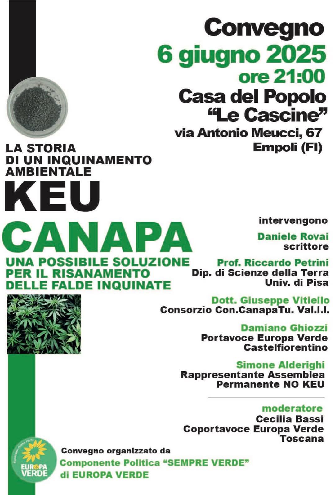 In questi ultimi anni in Toscana è emerso in modo inequivocabile come l'utilizzo come inerti degli scarti dei fanghi di depurazione essiccati, noti come KEU , ha determinato un diffuso inquinamento delle falde acquifere a causa del Cromo esavalente rilasciato nel tempo da tali scarti. Il convegno organizzato da Sempre Verdi, componente politica interna di Europa Verde, vuole ripercorrere la storia e le cause di questo inquinamento e prospettare una possibile soluzione, recentemente scoperta e brevettata, che prevede l'utilizzo del canapulo ottenuto dalla Canapa sativa.
