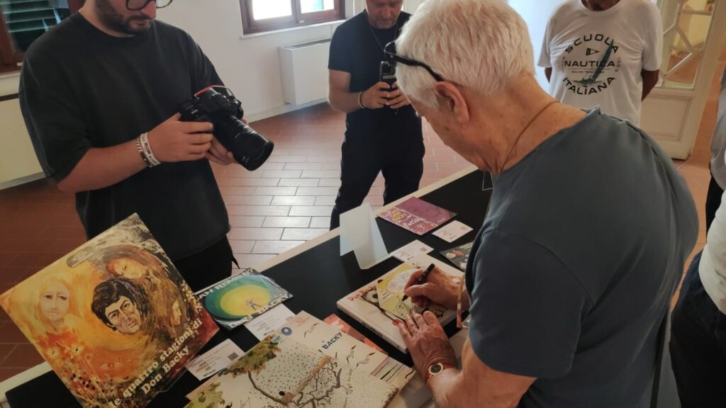 E' stata una visita gradita e piacevole, Don Backy mentre visitava la mostra ha avuto modo di raccontare storie e aneddoti legati a molti dei dischi in esposizione, lui che esordì all'inizio degli anni '60 ha conosciuto praticamente tutto il mondo della musica italiana e non solo. In particolare i suoi dischi sono stati l'occasione per ripercorrere, dalla voce di un testimone diretto, la storia del Clan e dell'epopea artistica del cantante santacrocese. Don Backy ha raccontato anche della sua passione per le arti grafiche e in particolare della sua attività di disegnatore, che lo portò anche ad auto produrre alcune copertine dei suoi dischi. “Ho sempre avuto una passione per il fumetto e per il disegno e in particolare per Ugo Pratt, tanto che molti anni fa realizzai una storia in parte ispirata a Corto Maltese, disegnando io stesso le tavole che poi fu al centro di una serie di trasmissioni della Rai”.